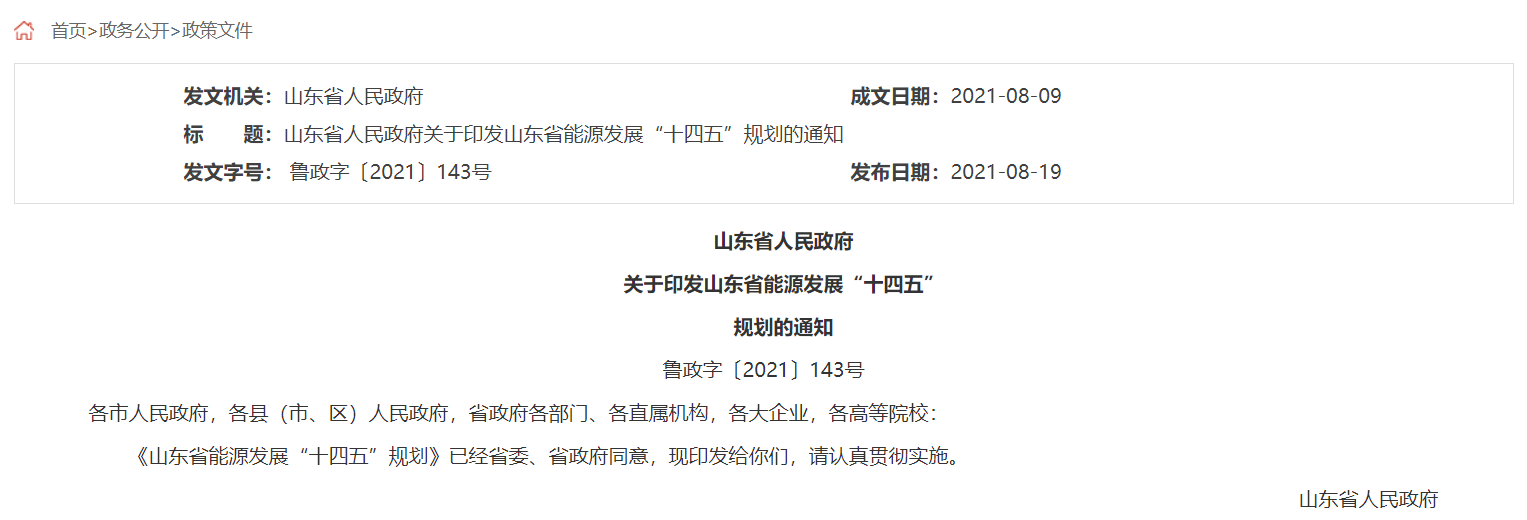 近日,山東省人民政府發布關于印發山東省能源發展“十四五”規劃的通知。